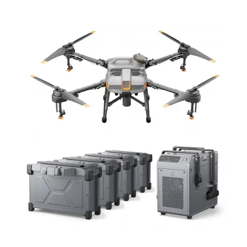 With fewer supporting components needed, the Agras T10 is easier to transport. A newly designed intelligent battery is covered by a 1-year warranty for 1,000 charges and 1,650 acres of flight; this ultra-long service life significantly reduces operating costs. The charging station and smart charging hub can charge a battery in 10 minutes, allowing for continuous operation with just two batteries and one charger.